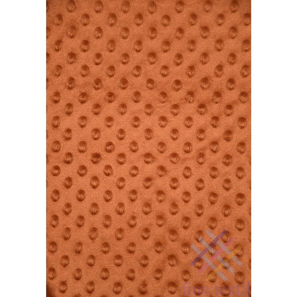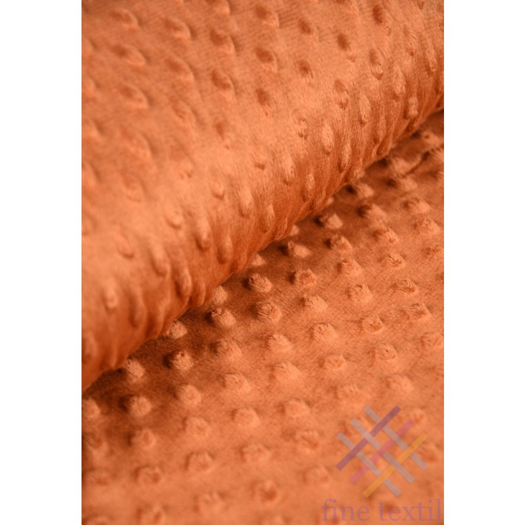 Jednofarebné minky v tehlovej farbe, je veľmi príjemný a hebký materiál, mierne elastický s drobnými guličkami. Je to tkanina , ktorá nedráždi pokožku, veľmi mäkučká a je príjemne hrejivá.