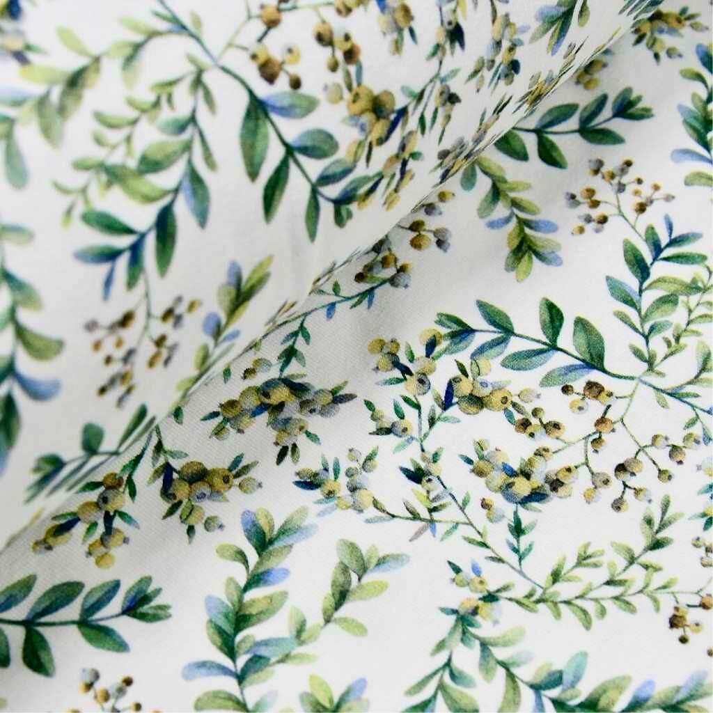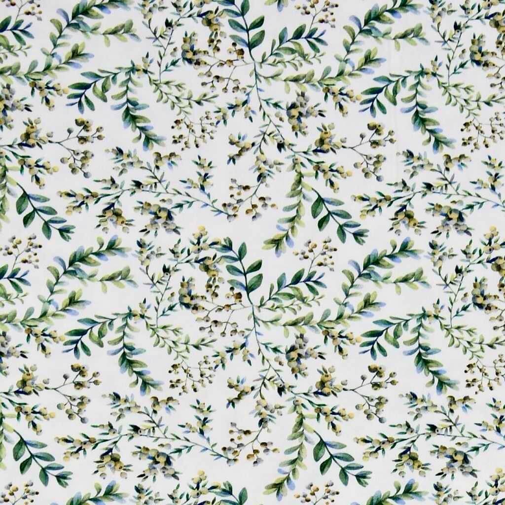 Vzorovaný úplet na bielom podklade s peknými motívmi olivovníka, je ideálny na šitie tričiek, tielok, šiat,legín. Úplet je látka so širokým využitím. Pridaným elastanom zaručí, že výsledné oblečenie bude veľmi pohodlné.